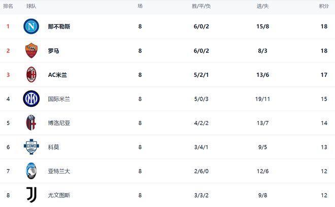 在积分榜上,那不勒斯6胜2负,拿到18分,排名榜首。罗马的战绩和那不勒斯一模一样,但是因为净胜球落后,不得不排名第2。AC米兰5胜2平1负,拿到17分,排名第3。第4的是国际米兰,5胜3负,拿到15个积分。博洛尼亚以14分排名第5。科莫13分排名第6。亚特兰大、尤文图斯和乌迪内斯都是12个积分。拉齐奥赢下这轮之后,总积分升到了11分,排名第10。